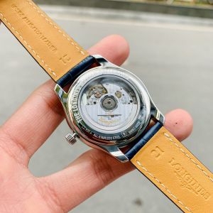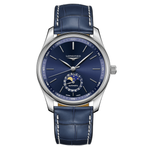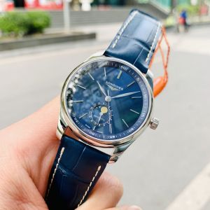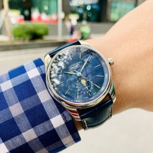Đồng hồ nam Longines Master L2.909.4.92.0 mặt tròn chải tia Sunbrust màu xanh blue cùng tone với dây da khóa gập trẻ trung. Đặc biệt, ô tròn lịch Tuần trăng - Moon phase góc 6h cực kỳ độc đáo, tích hợp luôn lịch ngày tại viền ô. Kim cọc số lá liễu sắc nhọn chỉn chu. Bộ máy L899 tần số 25'200, tích cót 72h, kính sapphire 2 mặt chống xước. Mặt sau lộ đáy cực đẹp. Case 40mm vừa tay, chịu nước 3ATM (30m).