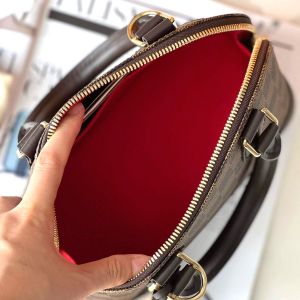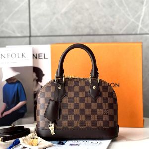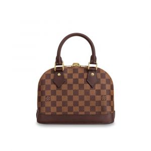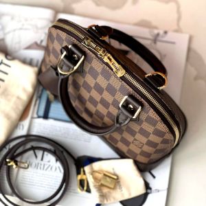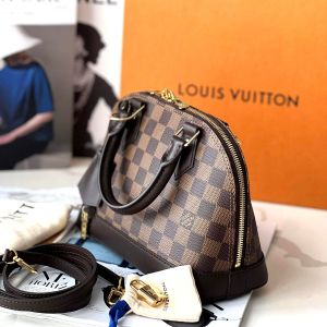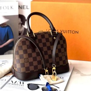 Túi xách Louis Vuitton Alma BB Damier Ebene N41221 được làm từ chất liệu canvas kẻ ô bàn cờ độc quyền của hãng, lớp lót màu đỏ Sari Bordeaux quyến rũ. Form dáng theo phong cách Art Deco của những năm 1930 vừa cổ điển, vừa hiện đại. Màu nâu sang trọng với các chi tiết khoá zip và khoá mini màu vàng nổi bật. Tay cầm kèm dây đeo có thể tháo rời. Kích thước: 23.5 x 17.5 x 11.5 cm.