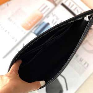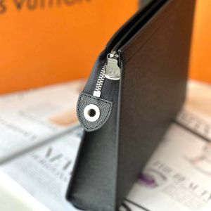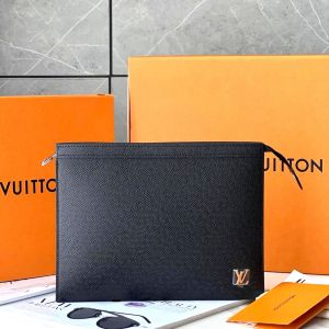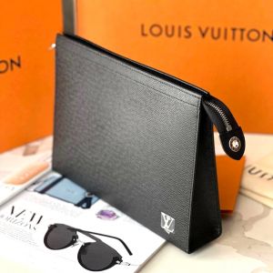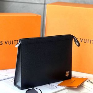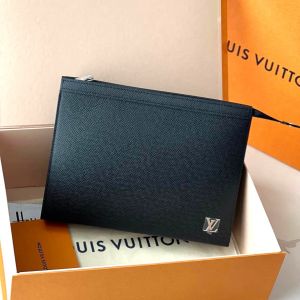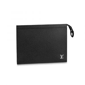 Clutch cầm tay Louis Vuitton Pochette Voyage màu đen được làm từ chất liệu da Taiga cao cấp, bề mặt sần rất riêng của hãng. Logo LV nổi màu bạc sáng bóng đính dưới góc phải. Kích thước: 27 x 21 x 6cm, với 1 ngăn nhỏ bên trong đựng riêng, 6 khe thẻ cắm tiện dụng, khóa kéo miệng kín an toàn.