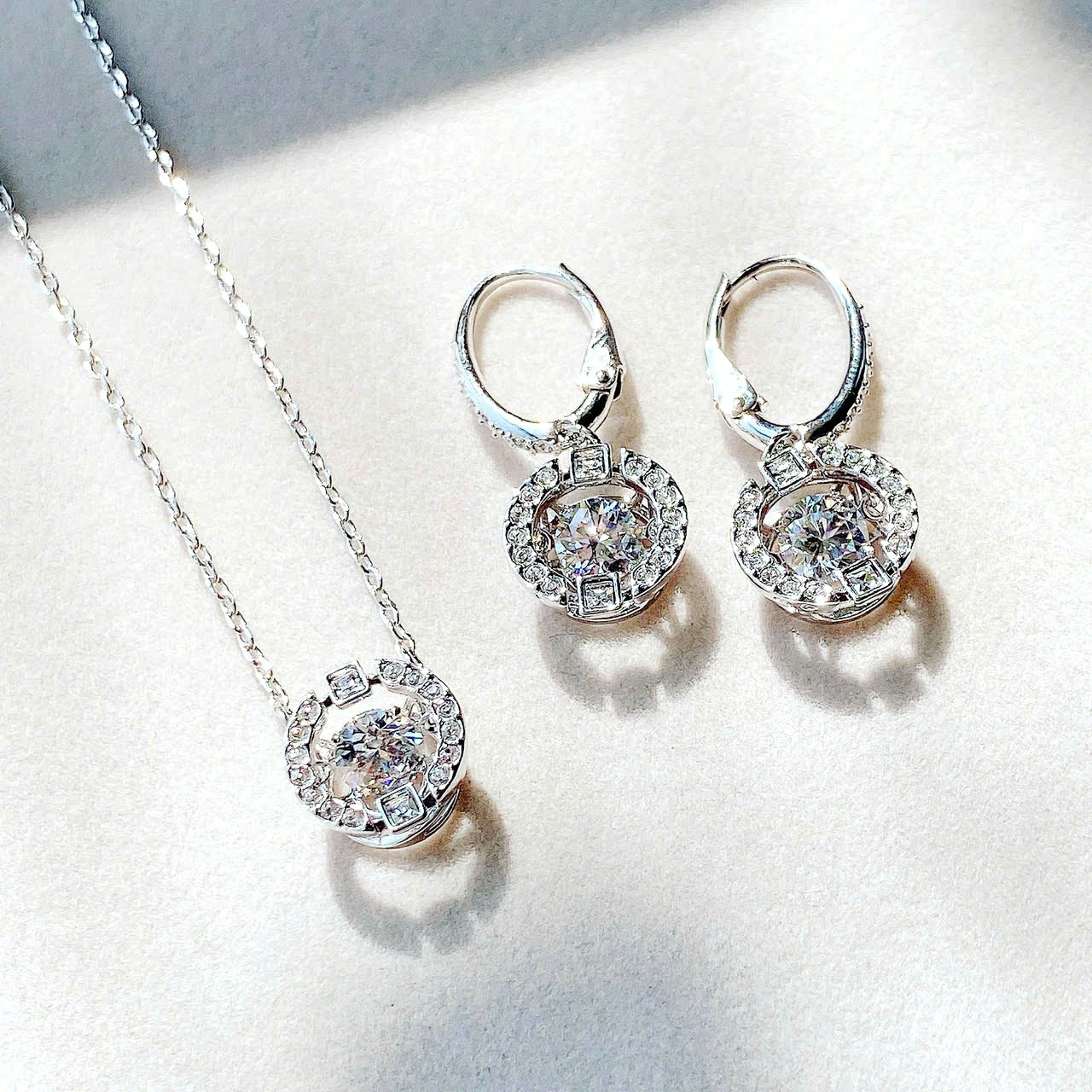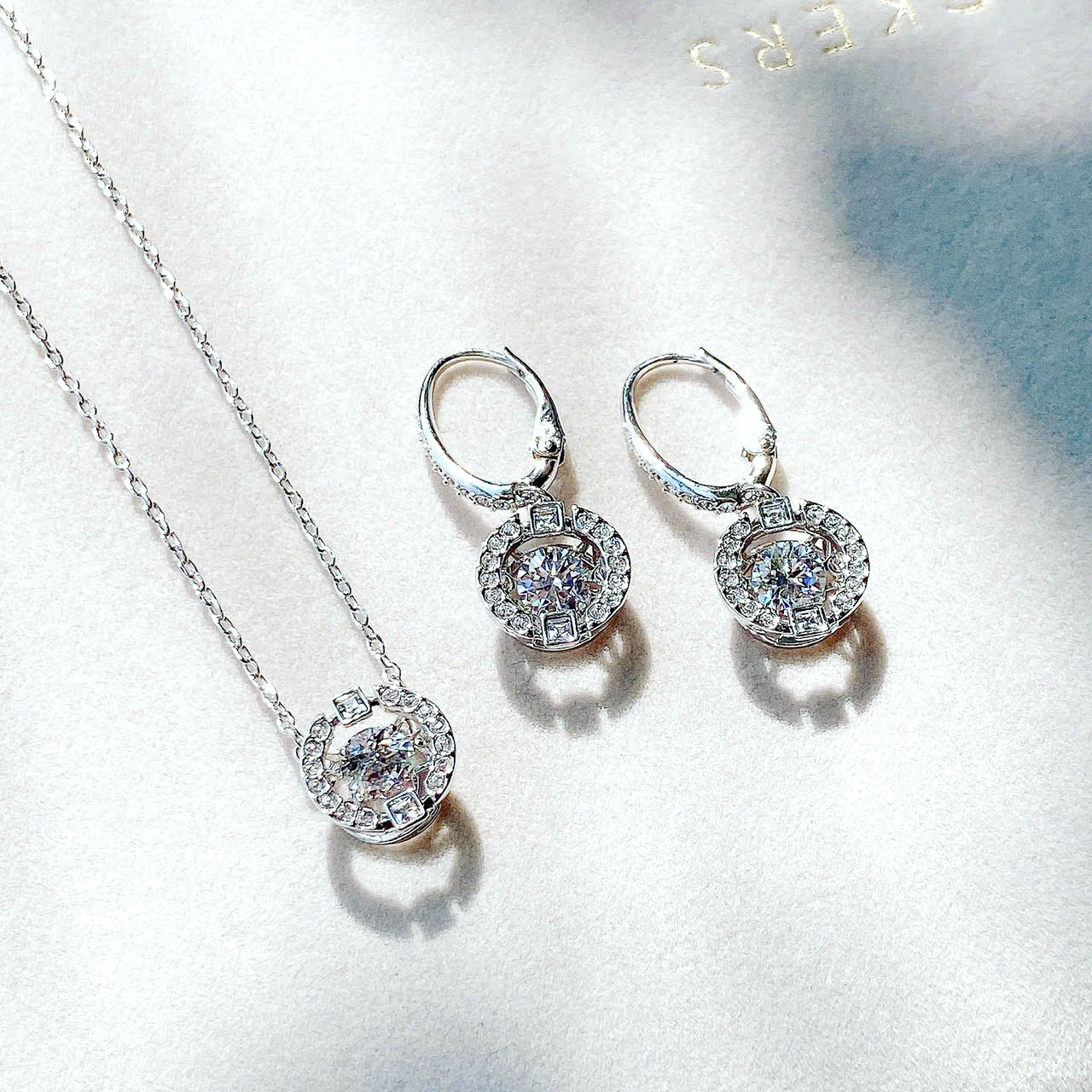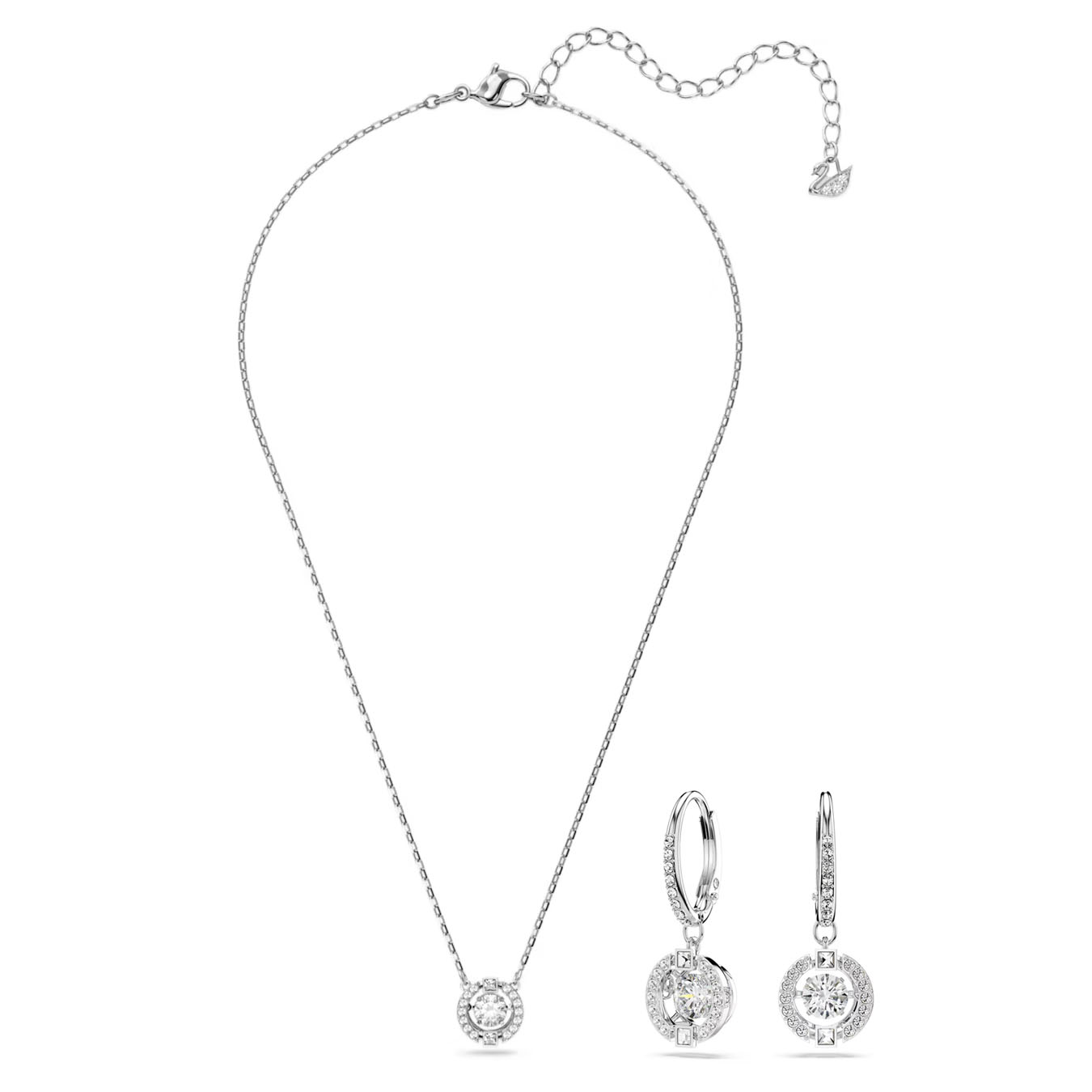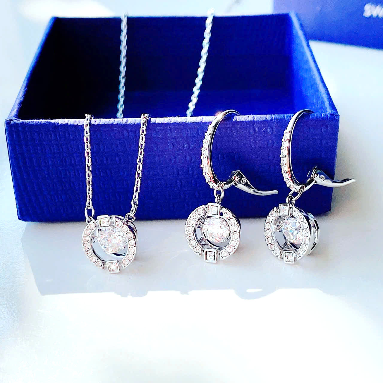 Set dây chuyền bông tai Swarovski Sparkling Dance 5504652 5286137 thiết kế độc đáo với viên Zirconia nhảy múa cùng chuyển động cơ thể, xung quanh là vòng tròn nạm đá pha lê, tiếp nối khung và dây mạ Rhodium màu bạc sáng bóng. Kích thước: 0.3 x 0.1 cm. Dây dài: 38cm.