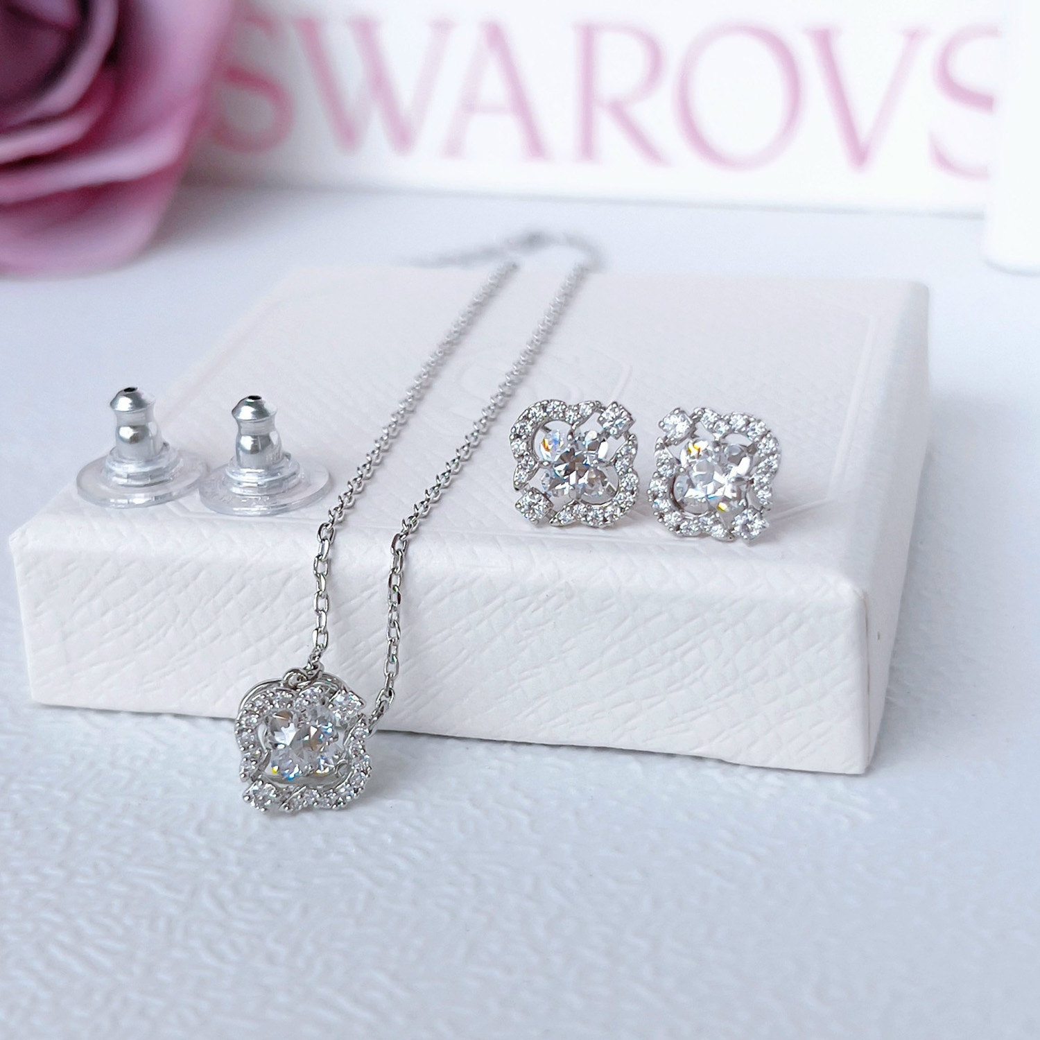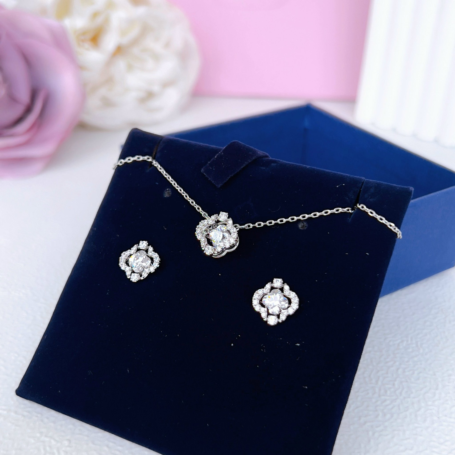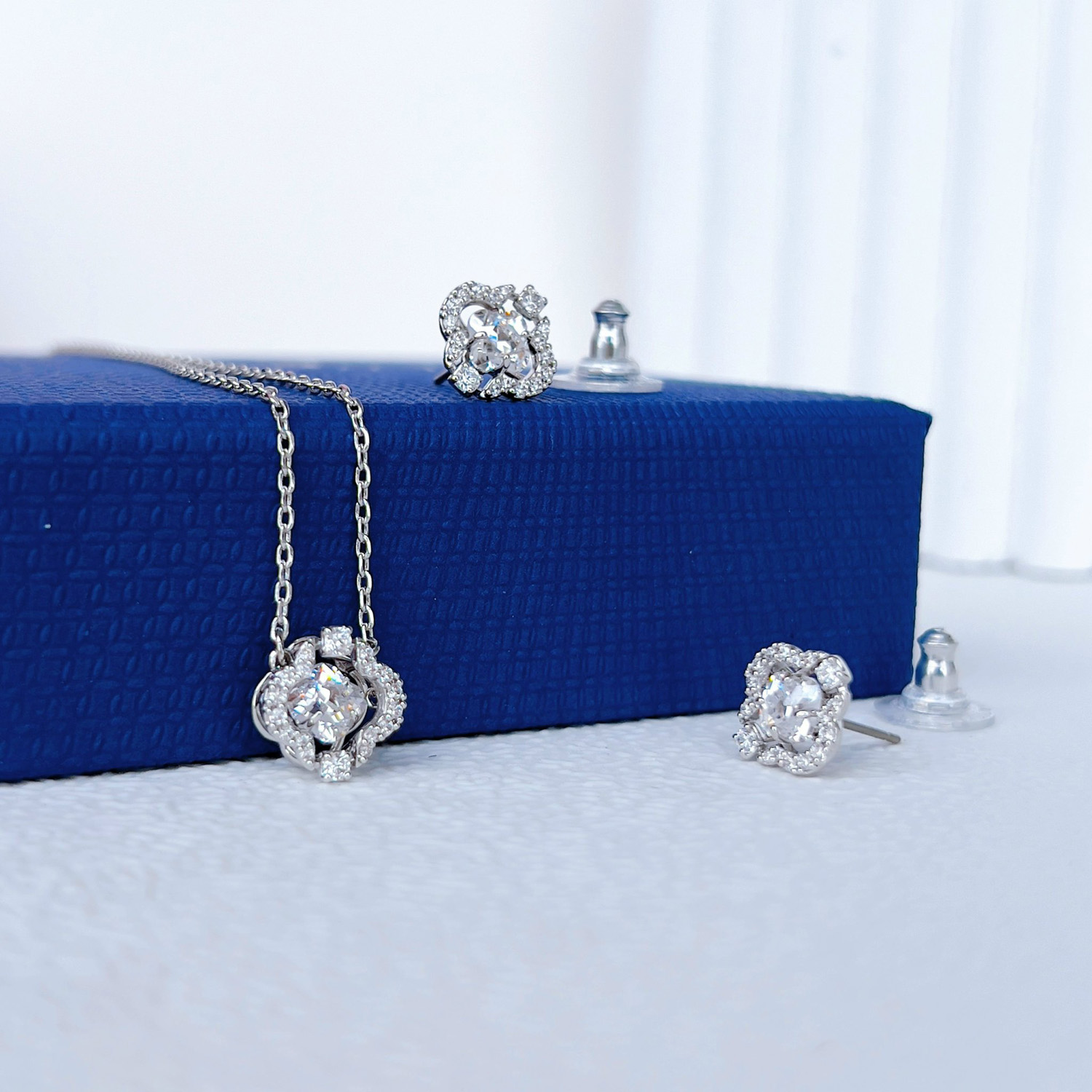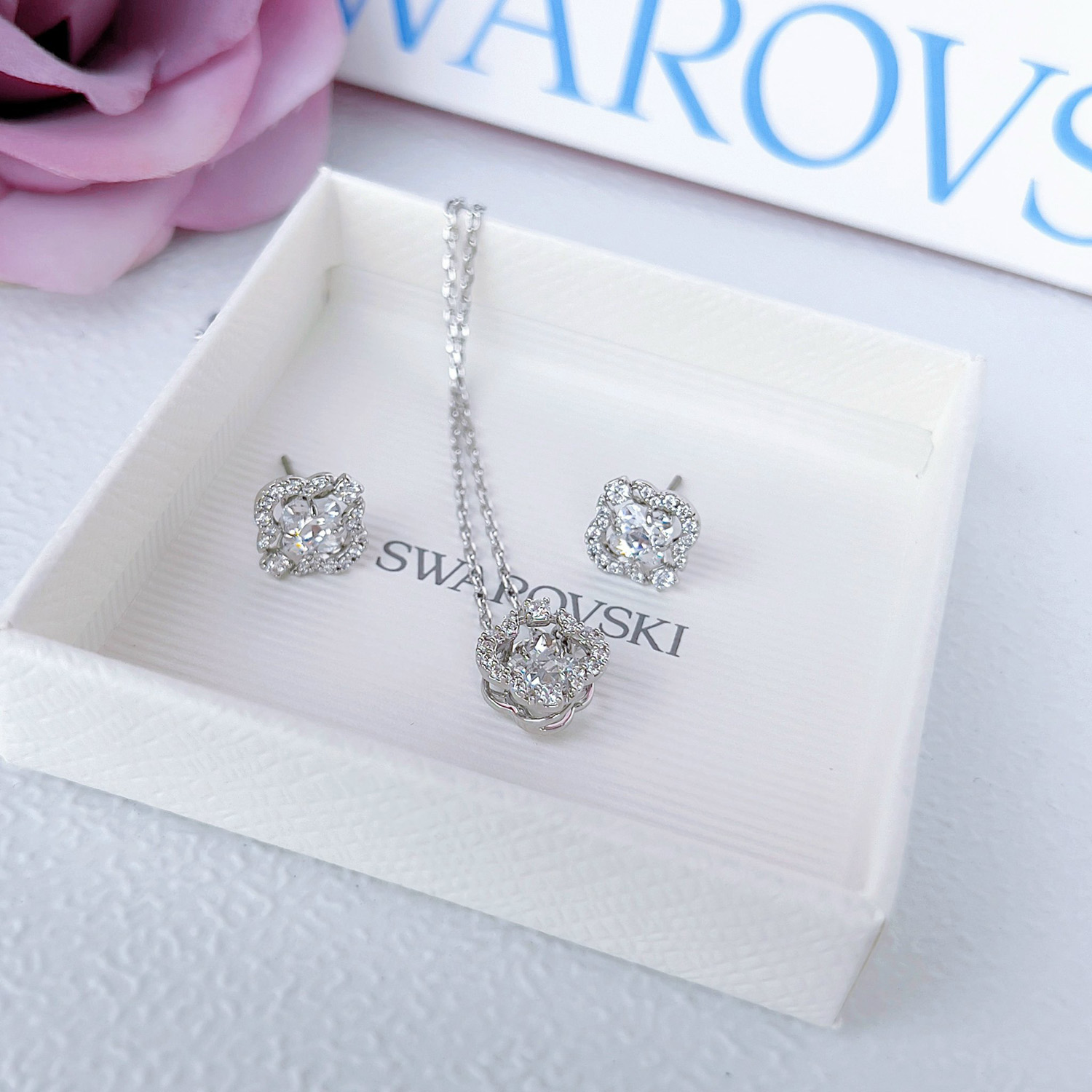 Set dây chuyền và bông tai Swarovski Sparkling Dance 5642929 hình cỏ bốn lá may mắn. Dòng Dancing này độc đáo ở thiết kế viên đá nhảy múa theo chuyển động của cơ thể. Tone màu bạc sáng bóng dễ phối đồ. Kích thước dây dài: 38cm. Kích thước mặt: 1cm.