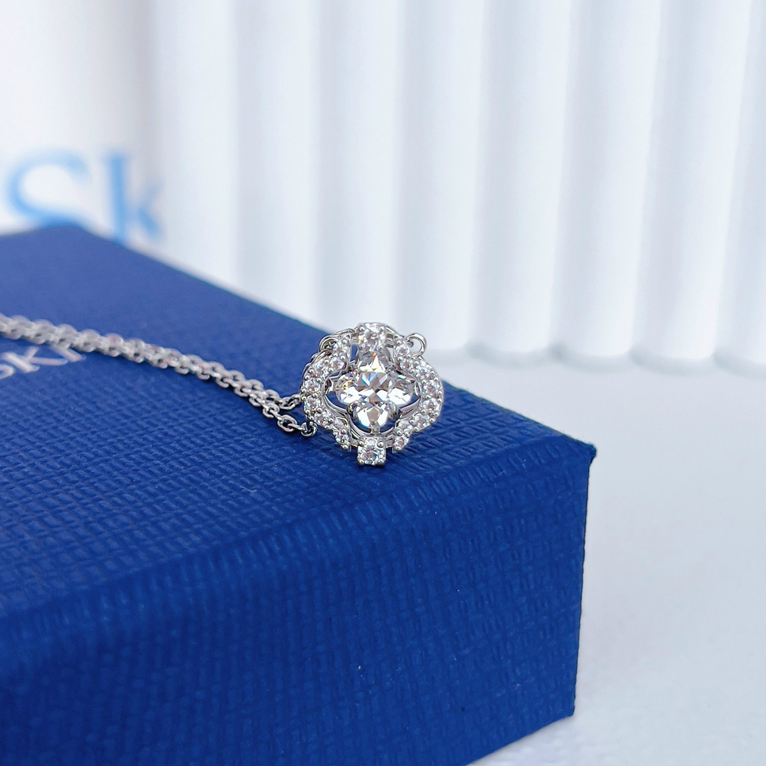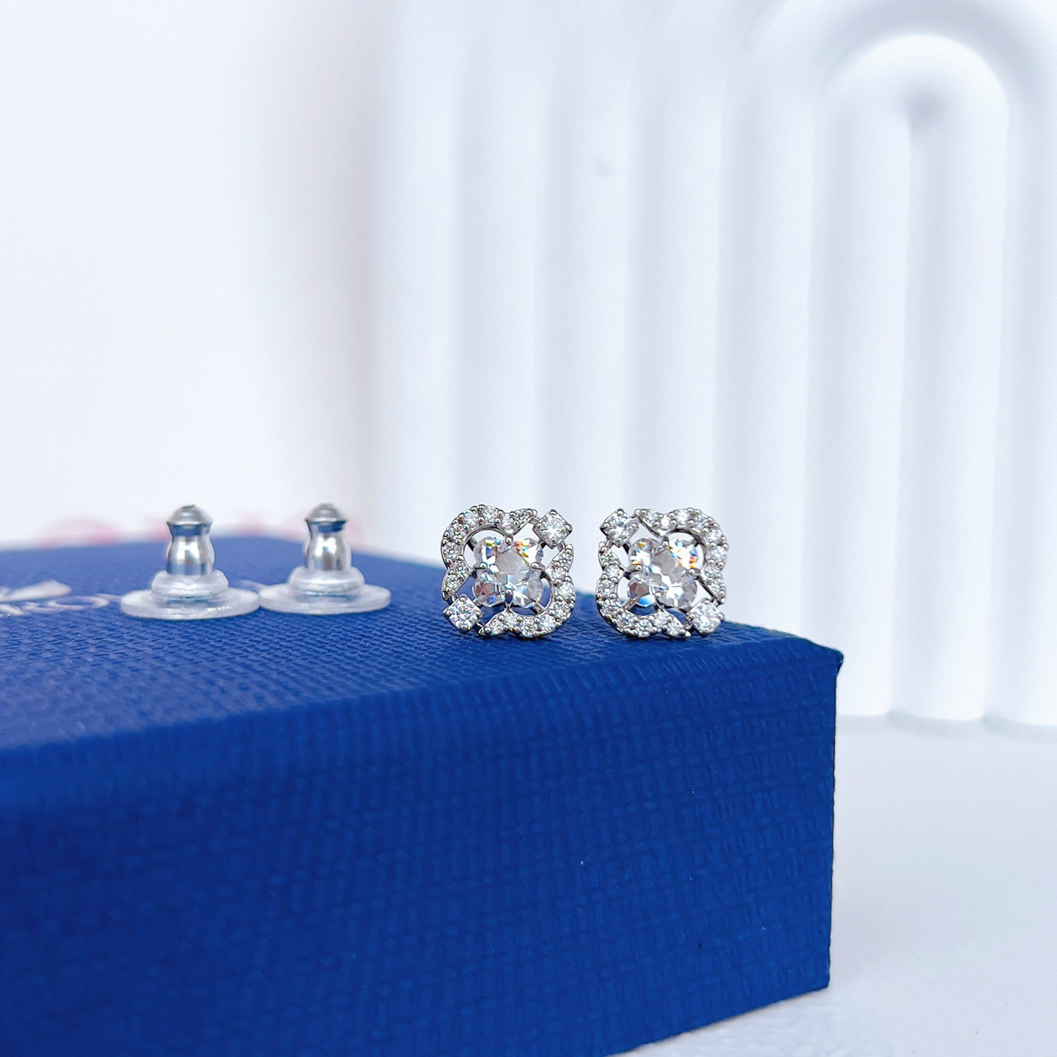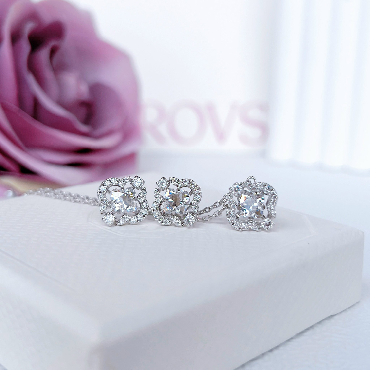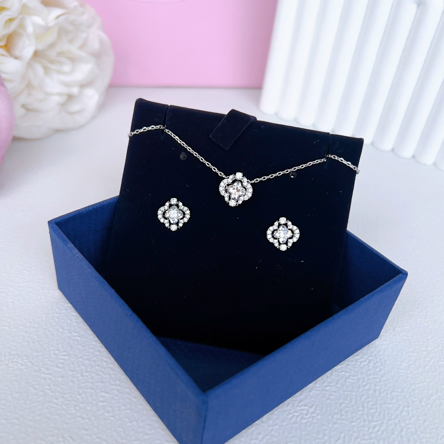 Set dây chuyền và bông tai Swarovski Sparkling Dance 5642929 hình cỏ bốn lá may mắn. Dòng Dancing này độc đáo ở thiết kế viên đá nhảy múa theo chuyển động của cơ thể. Tone màu bạc sáng bóng dễ phối đồ. Kích thước dây dài: 38cm. Kích thước mặt: 1cm.