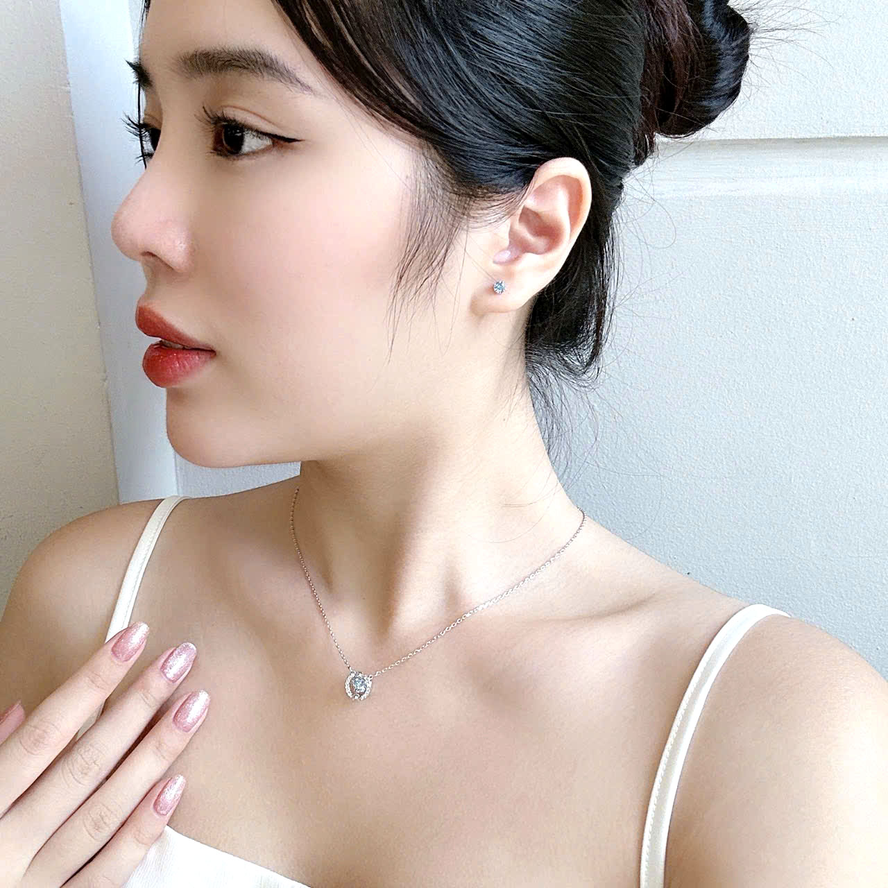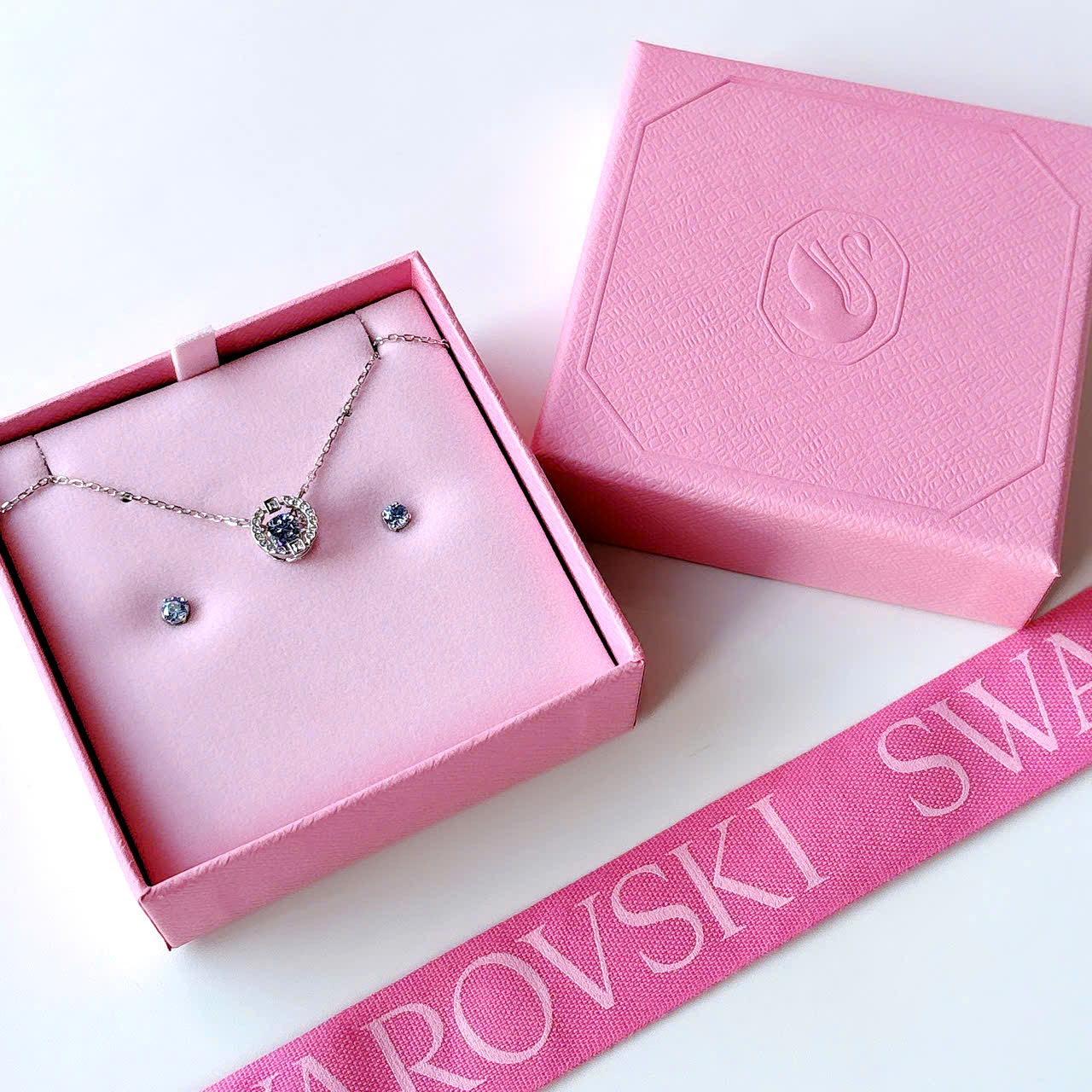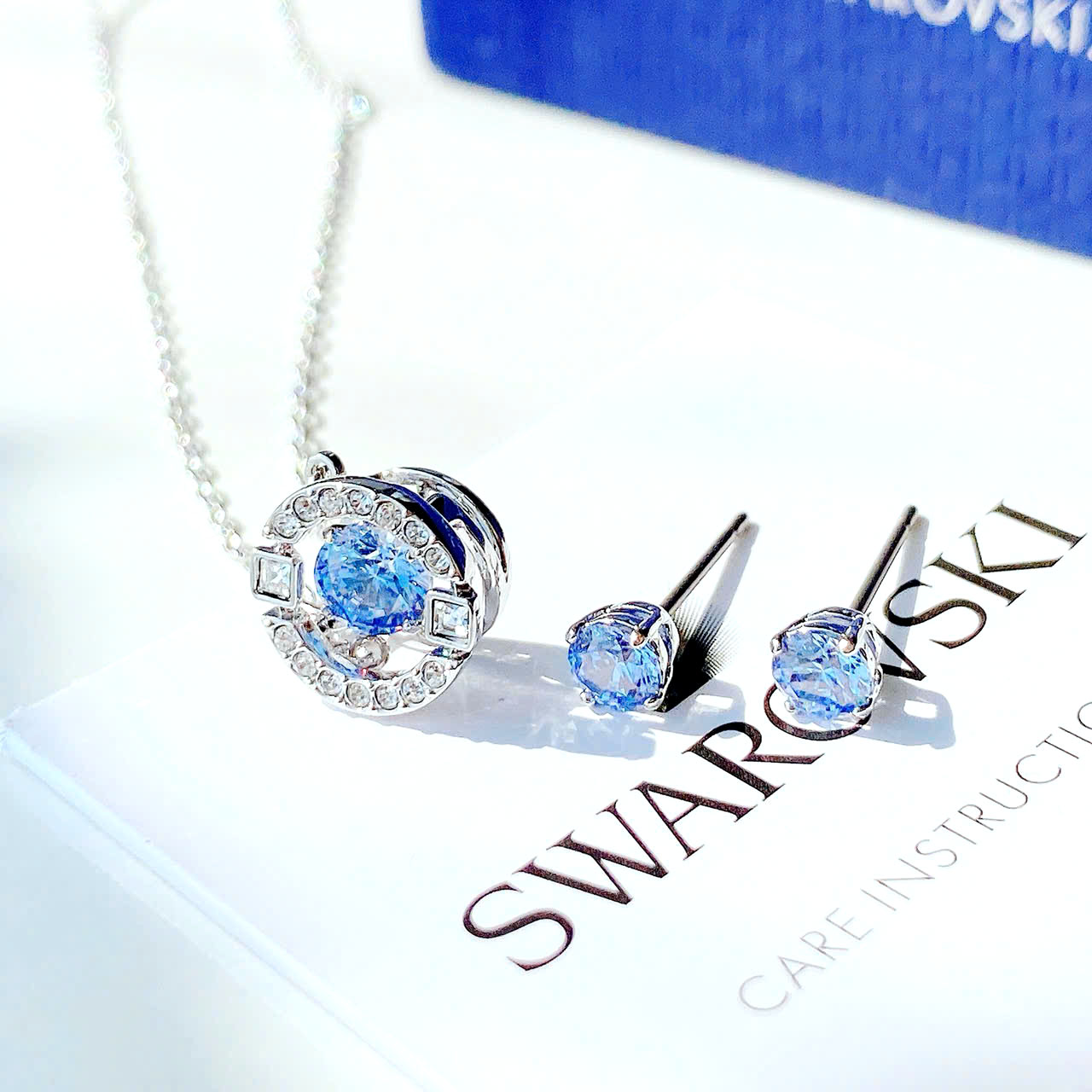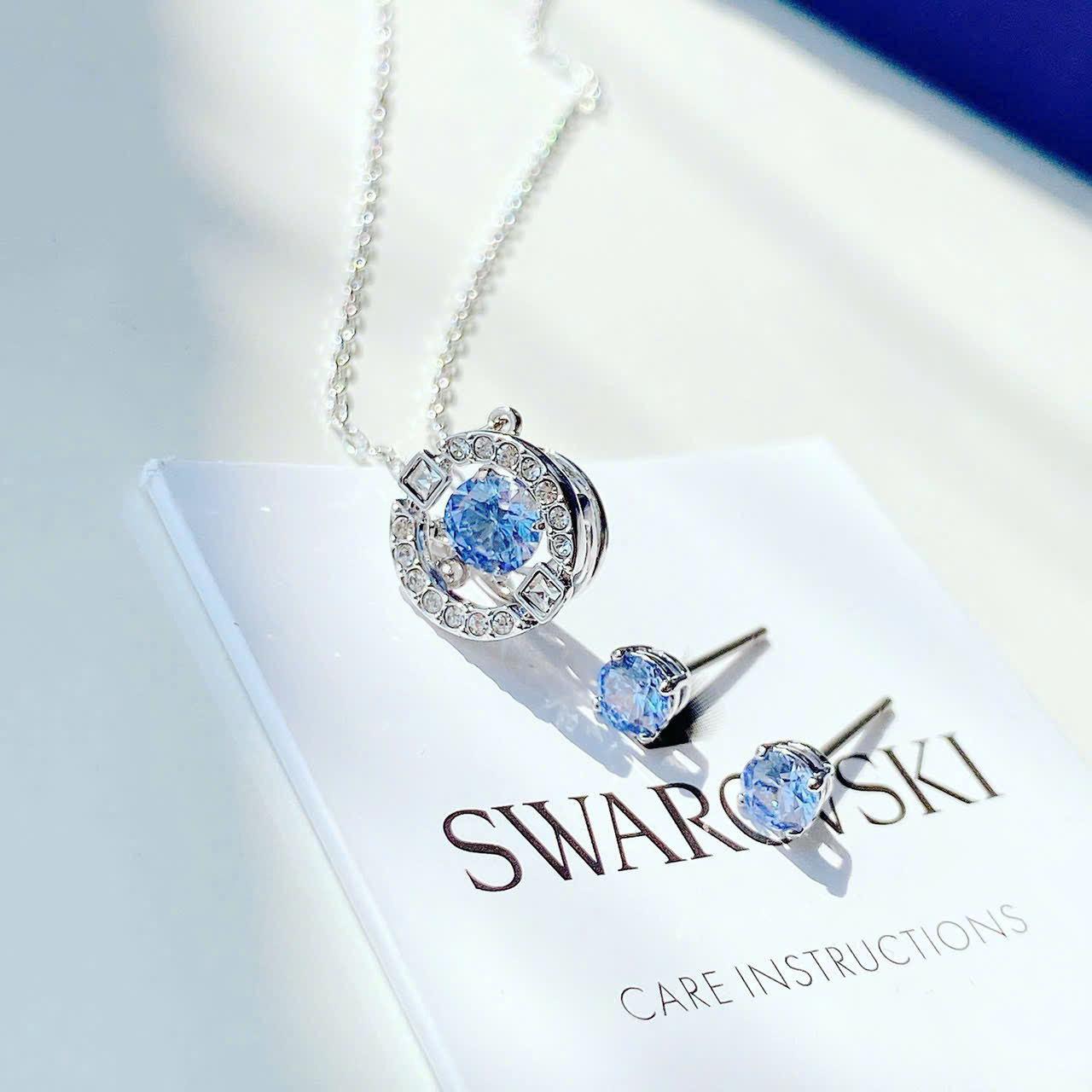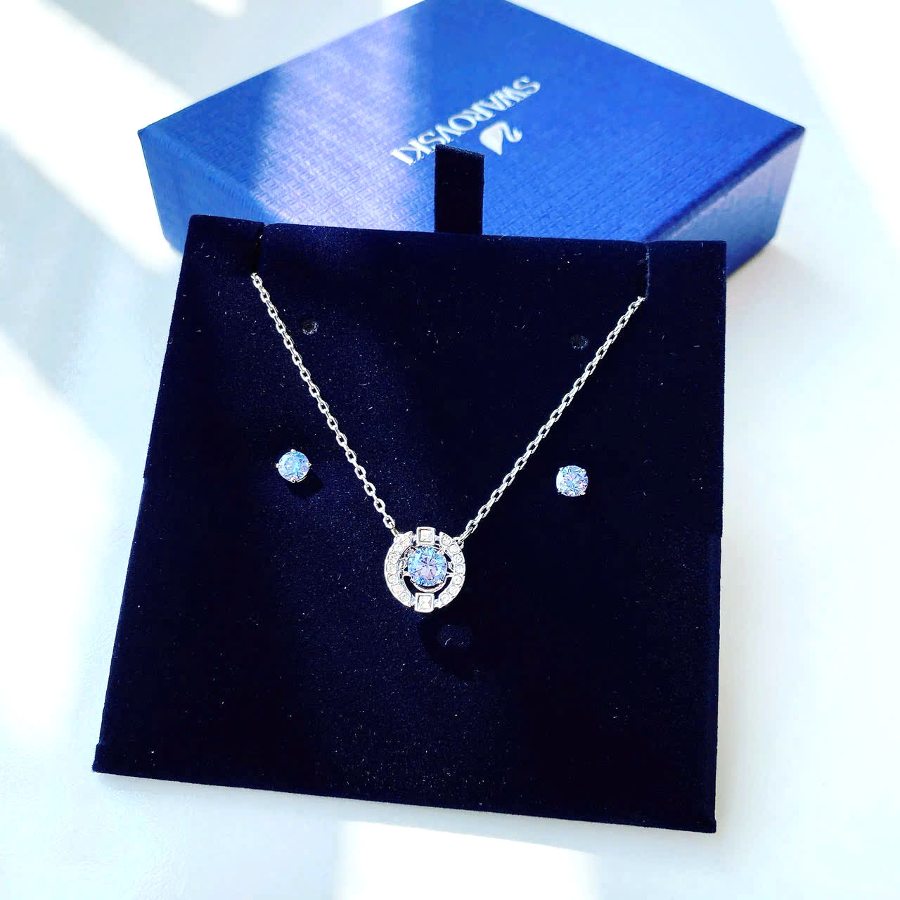 Set dây chuyền bông tai Swarovski Una Sparkling Dancing 5480485 thật trẻ trung với một viên Zirconia màu xanh được treo lơ lửng trong khung tròn nạm đá pha lê trong suốt, lấp lánh theo từng cử động của cơ thể. Bông tai (nụ) nhỏ xinh mà vẫn rất nổi bật. Kích thước: dây dài 38cm.